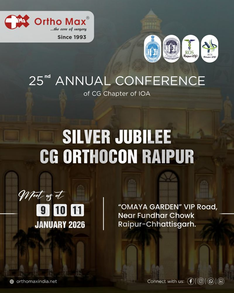 Ortho Max is excited to be part of the 50th OOACON Annual Conference (Golden Jubilee) by the Odisha Orthopaedics Association. Join us at Swosti Premium, Puri – Odisha on 23–25 January 2026 as we connect with leading orthopaedic minds, share innovations, and celebrate progress in patient care — especially for “Old is Gold: 360° Care for the Elderly” focusing on mobility, dignity, and longevity.